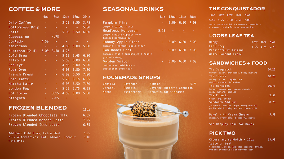 Signature Drinks: The menu highlights unique house specialties like The Conquistador, a distinctive mocha latte or cappuccino infused with cayenne, turmeric, and cinnamon. Another notable item is the Affogato, combining espresso with ice cream for a classic coffee dessert experience.